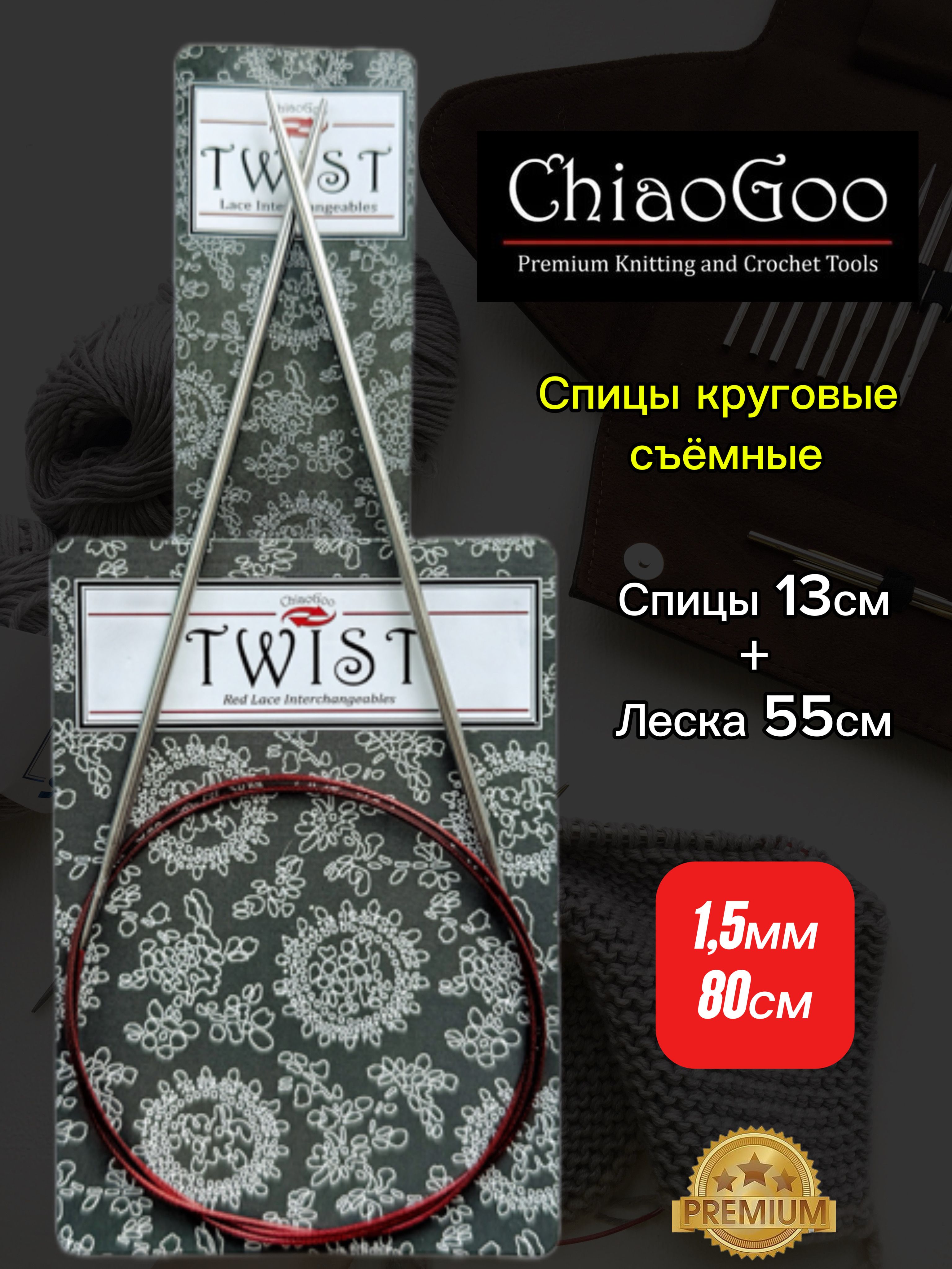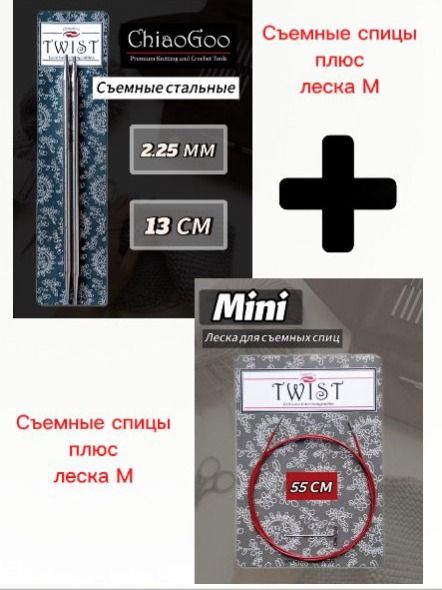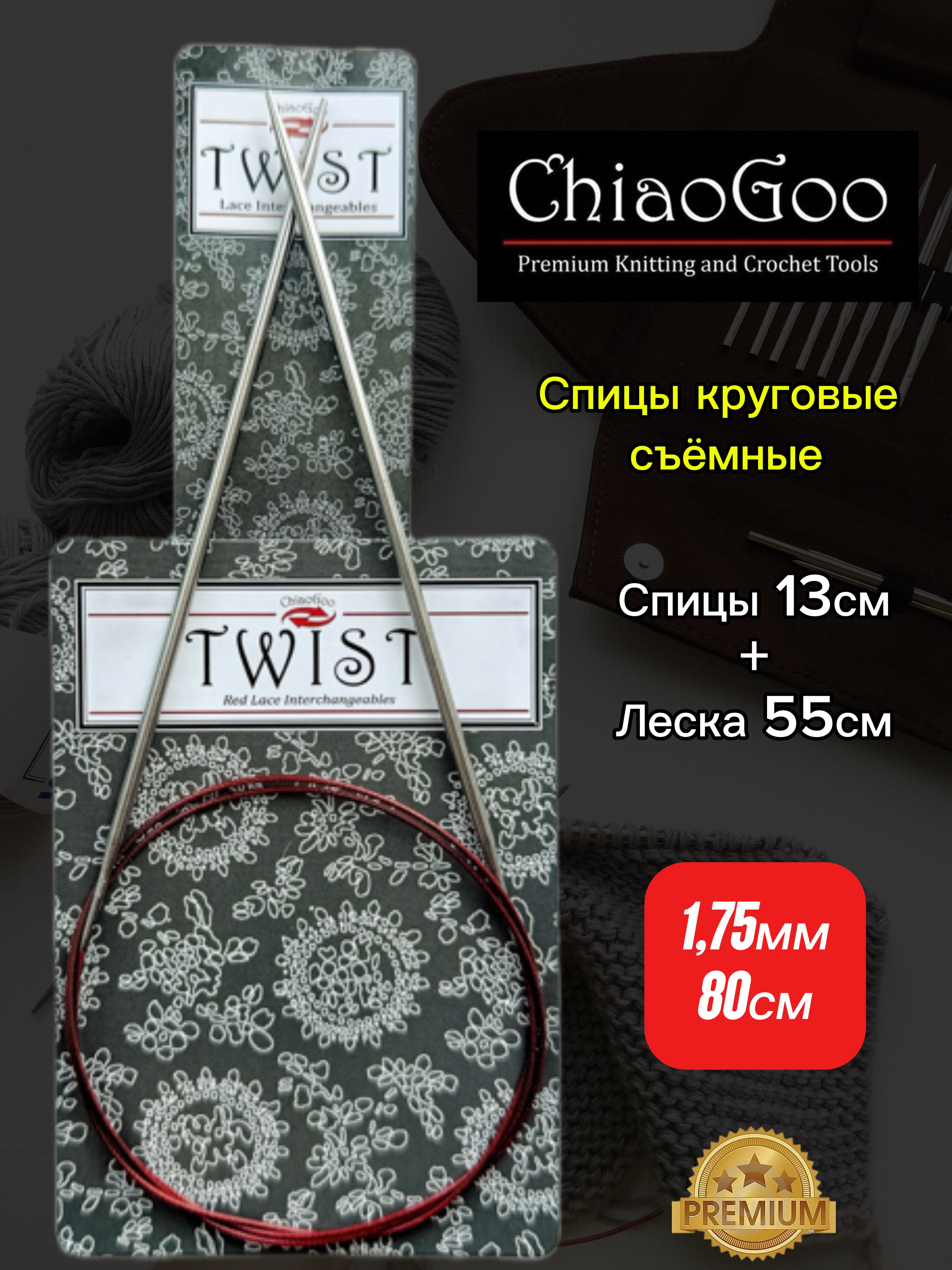 ChiaoGoo, Спицы круговые съемные 2,25мм+ леска 55см, готовая длина 80см, хирургическая сталь, без эффекта памяти